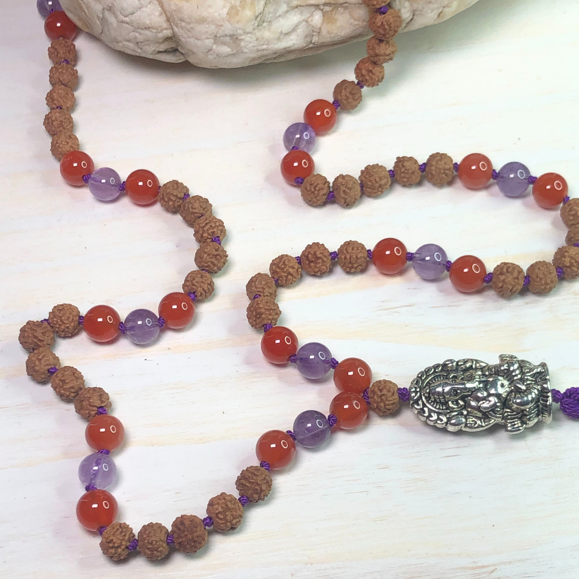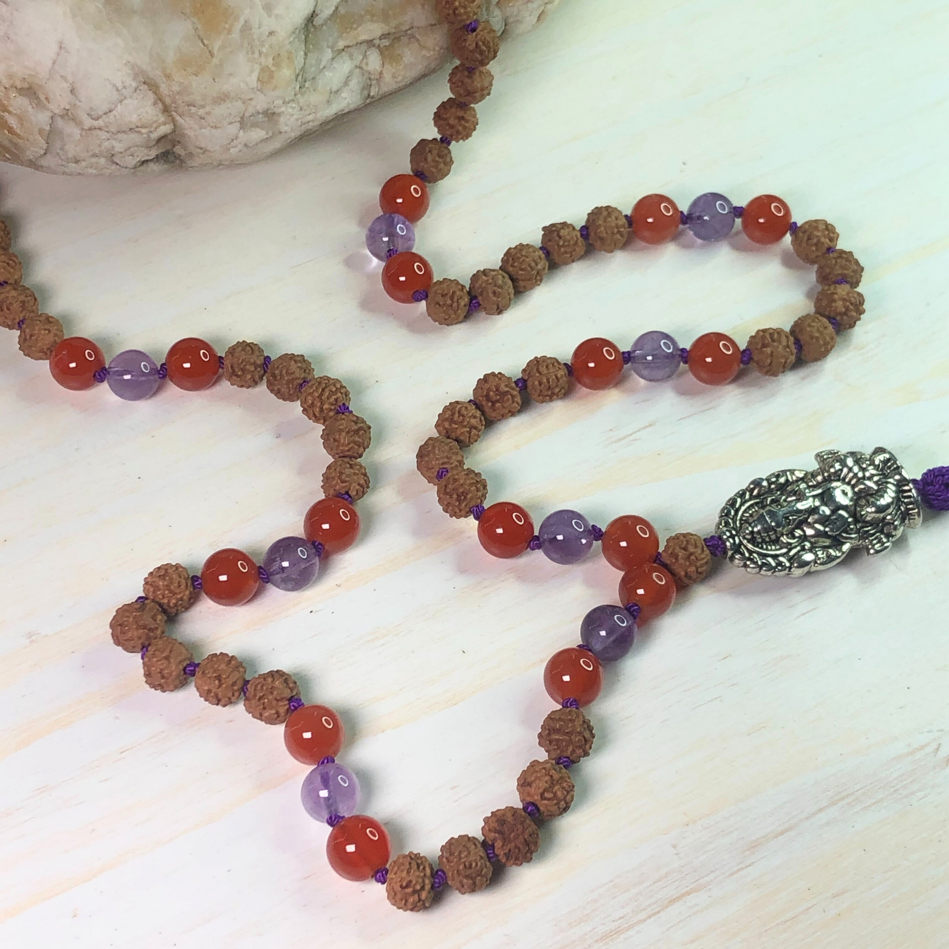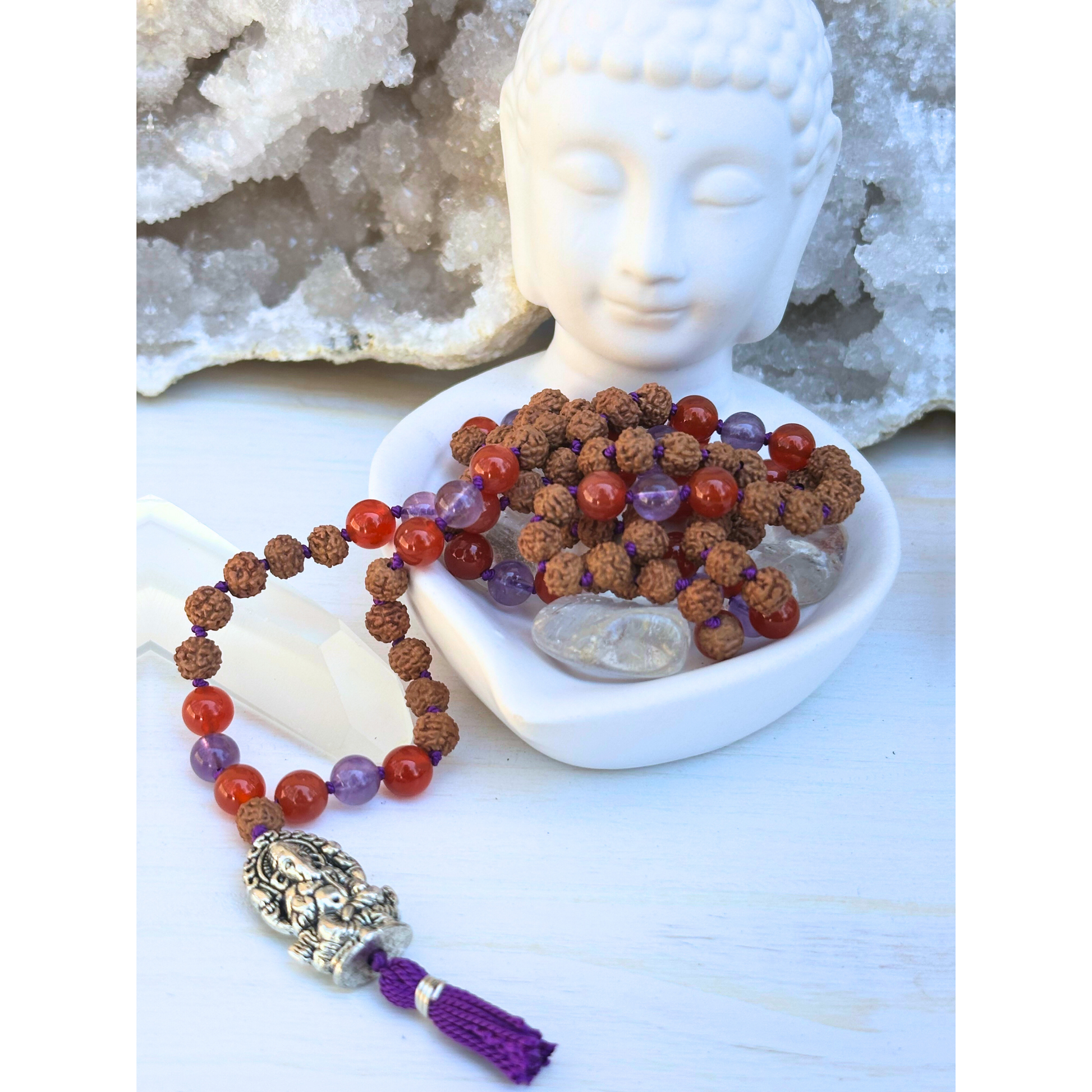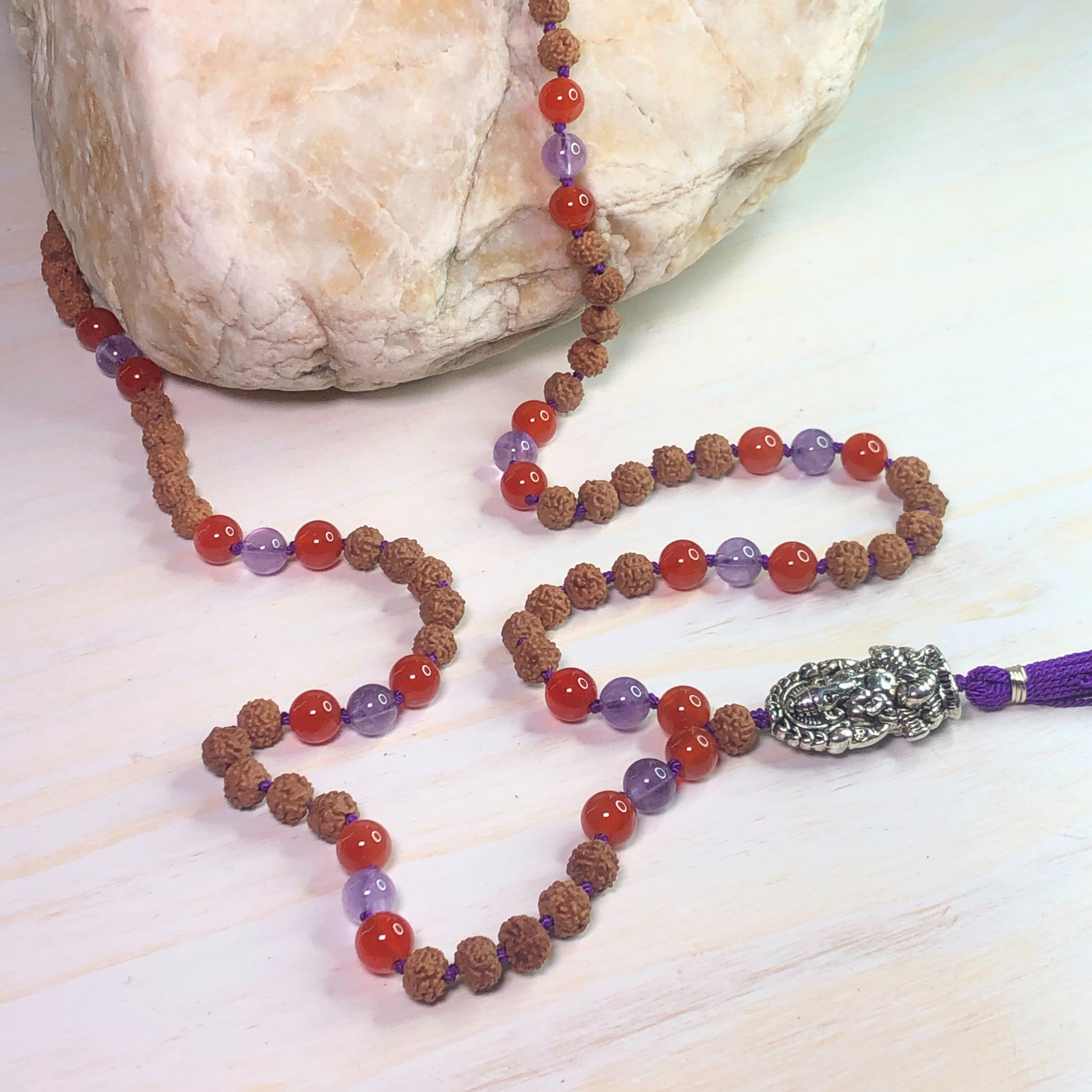 Carnelian, Amethyst & Rudraksha Mala with Ganesha Charm