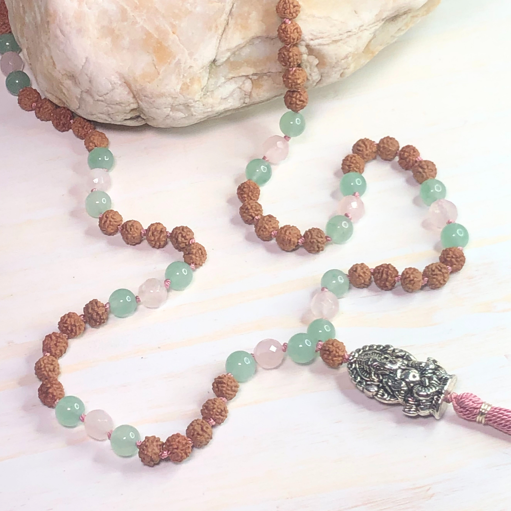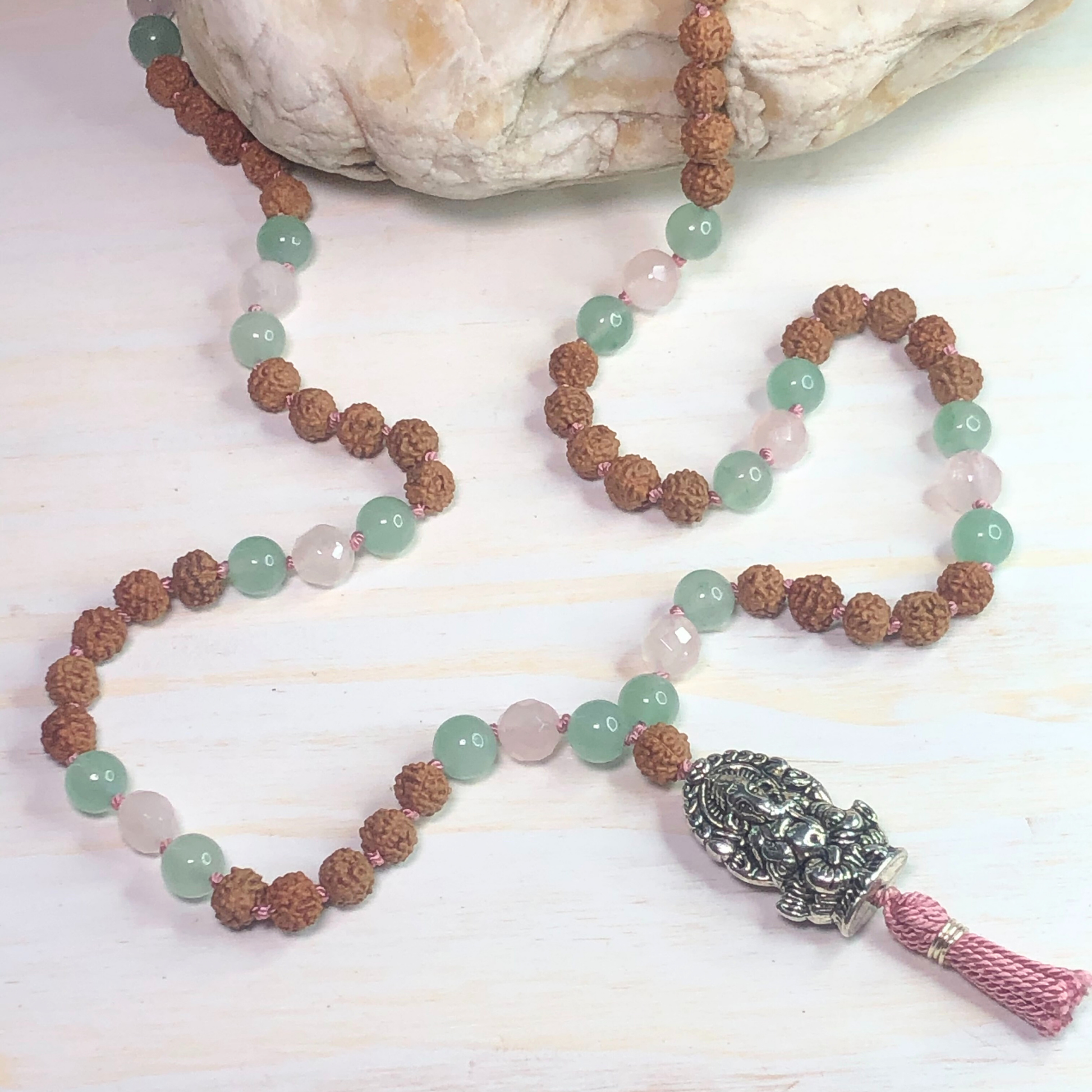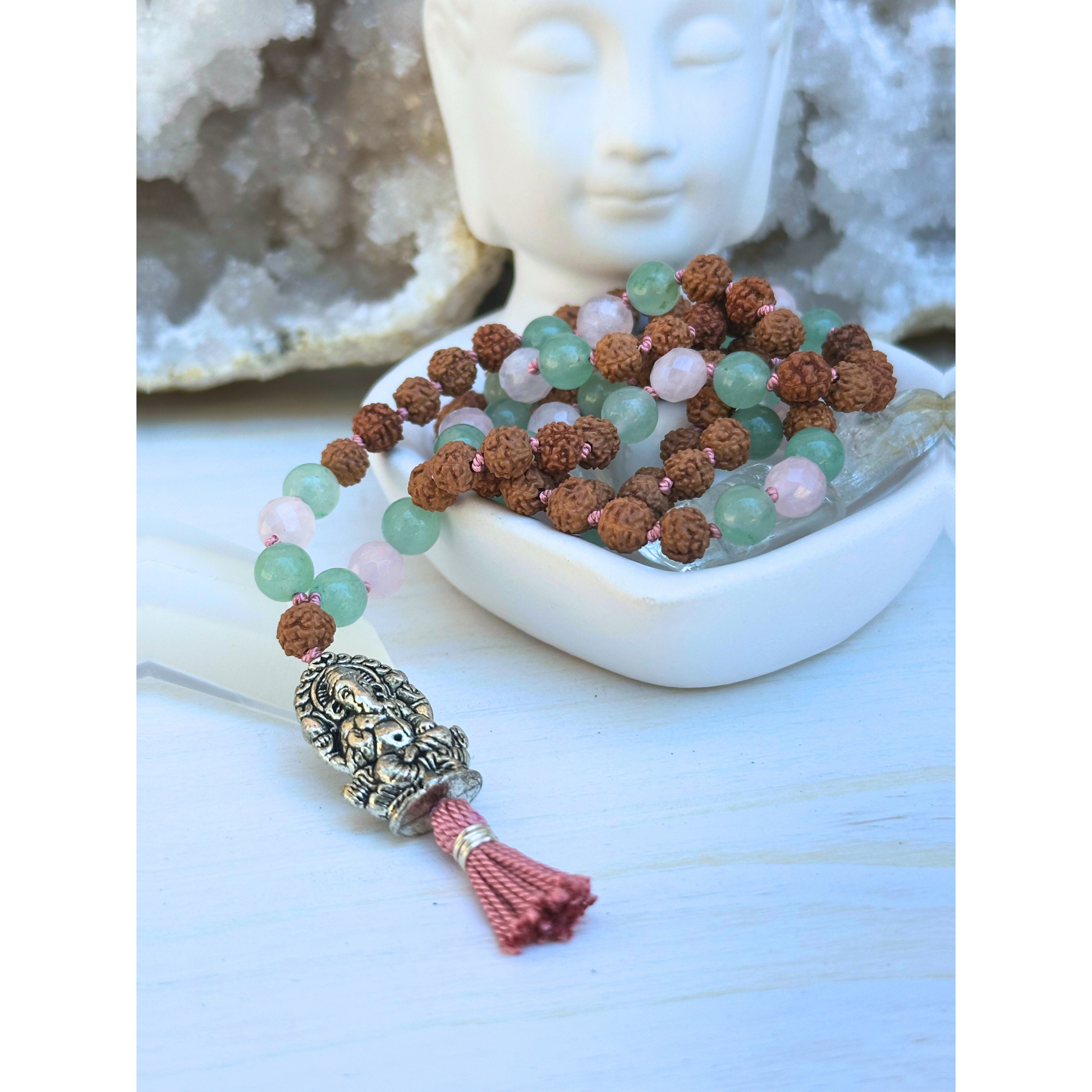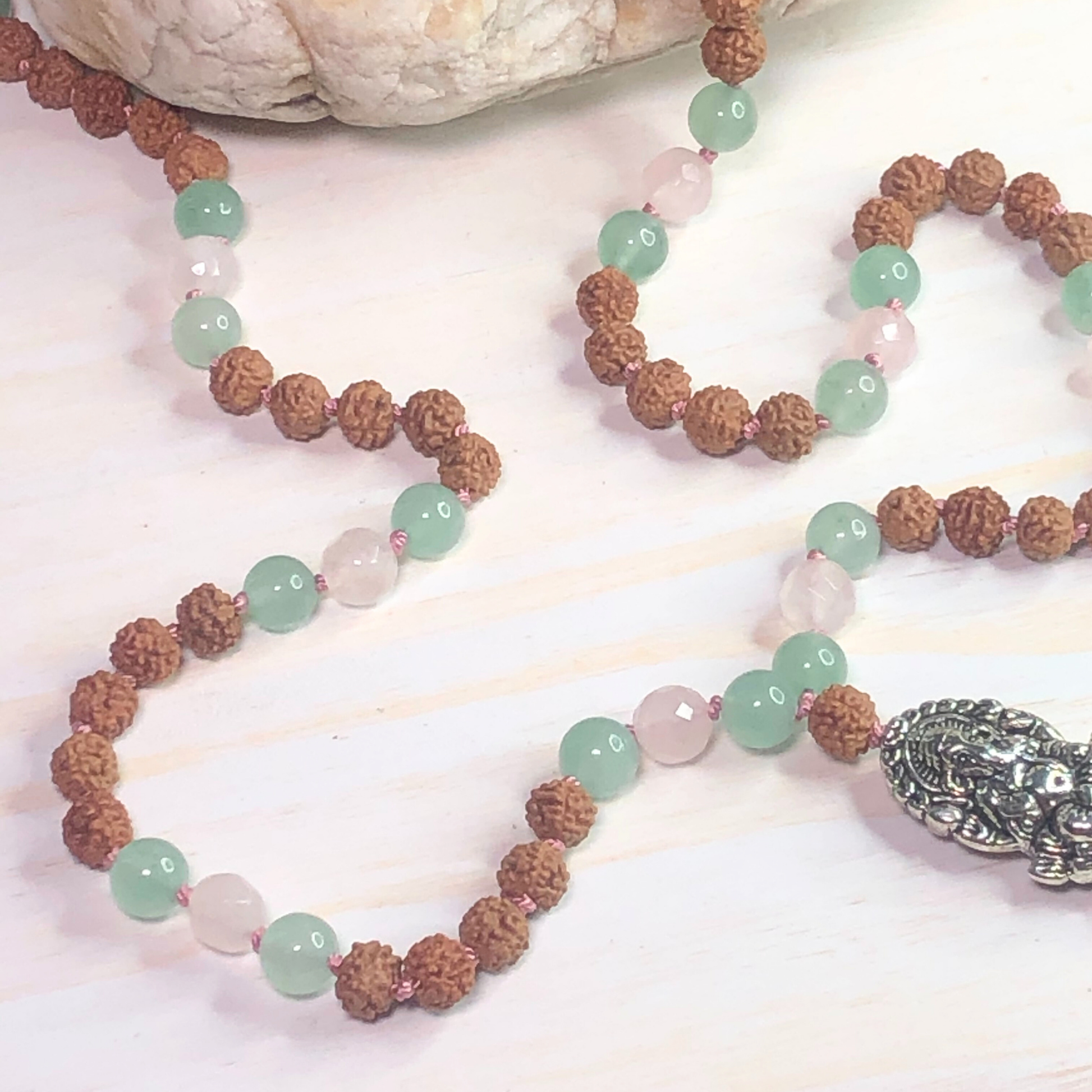 Green Aventurine, Rose Quartz & Rudraksha Mala with Ganesha Charm