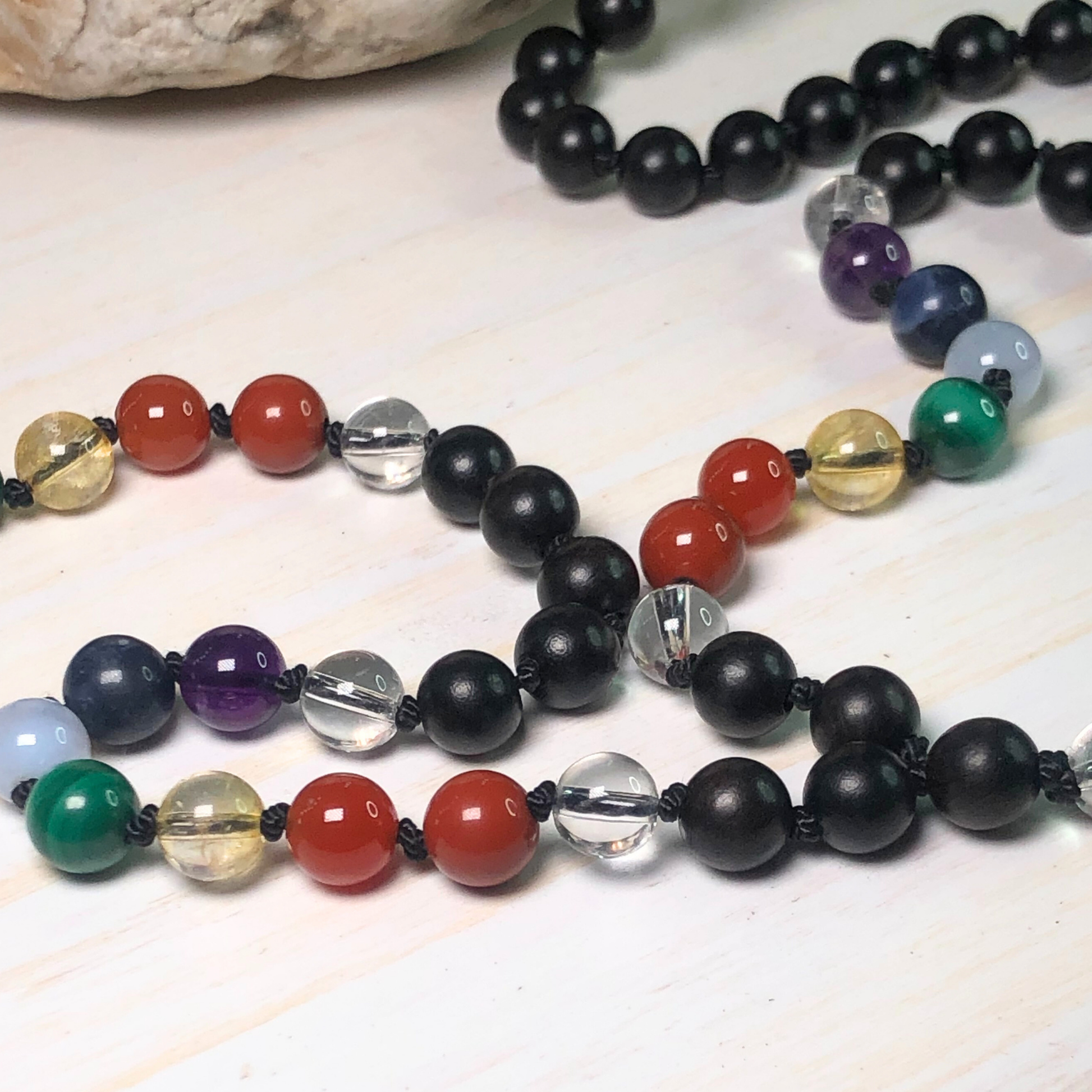 This mala was intended for the chakras. It was created using Red Jasper, Carnelian, Citrine, Malachite, Blue Chalcedony, Lapis Lazuli and Amethyst. Each stone was selected to open and stimulate each one of the chakras. Clear Quartz was added as an amplifier and cleanser. The Macassar Ebony adds the elements of protection, power, balance and purity.