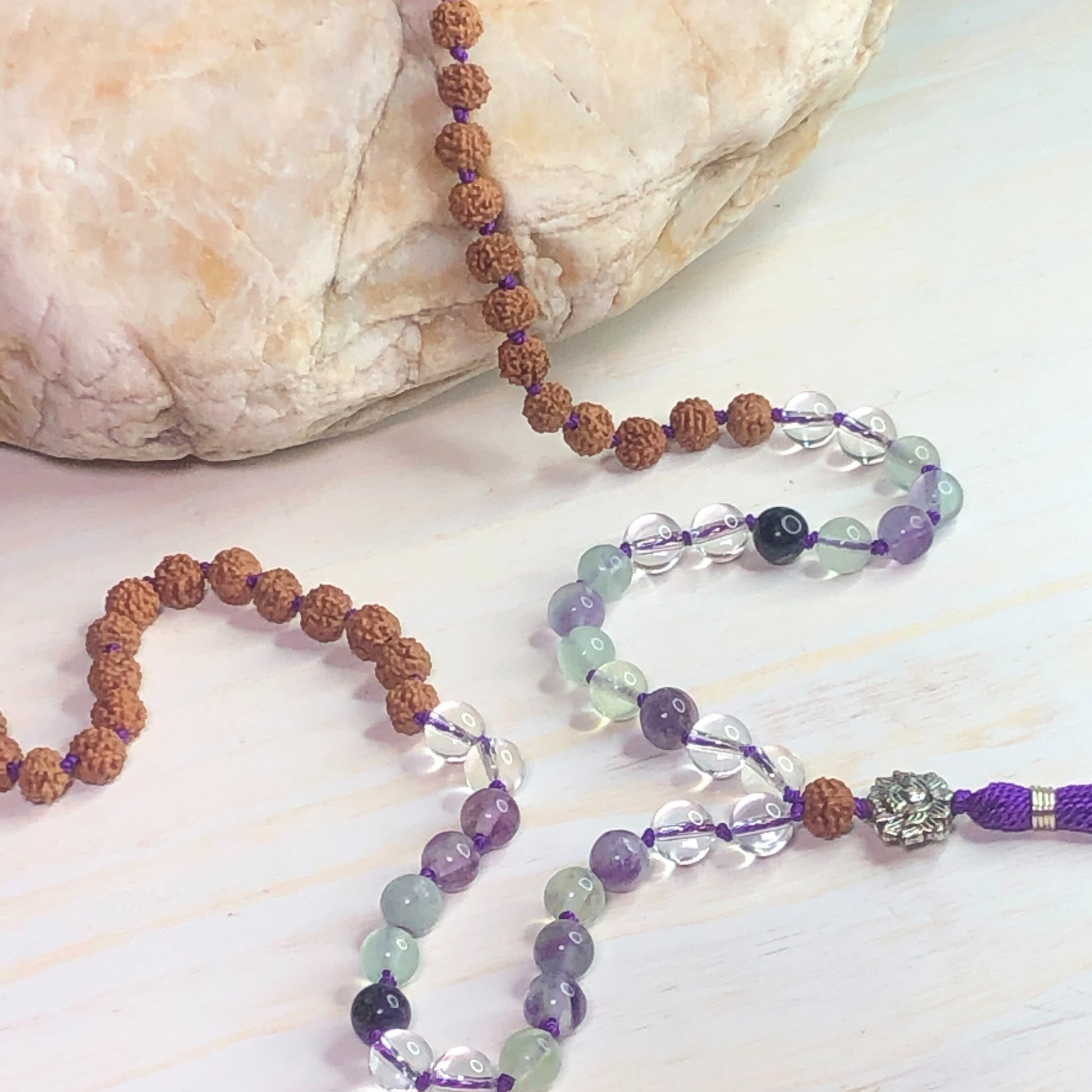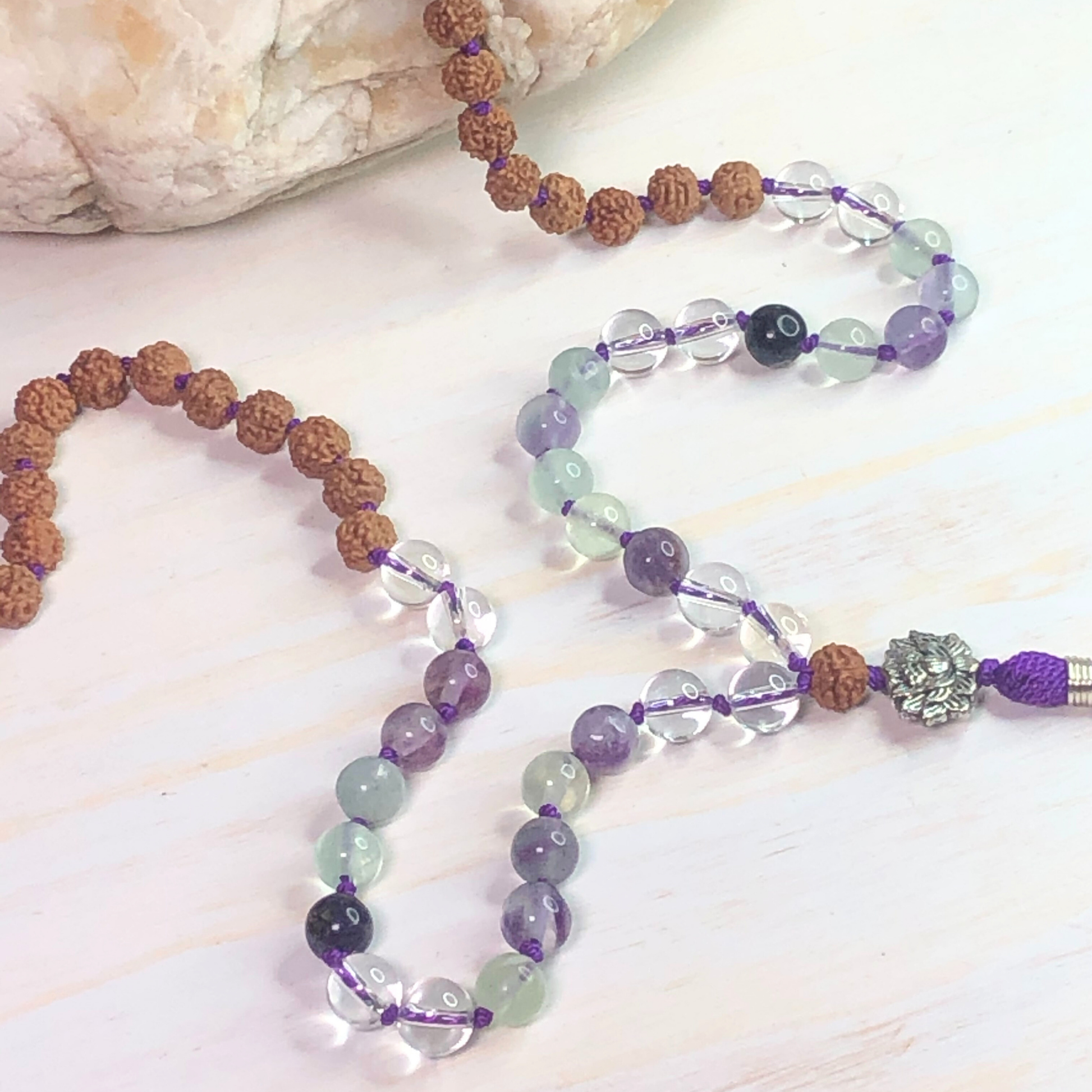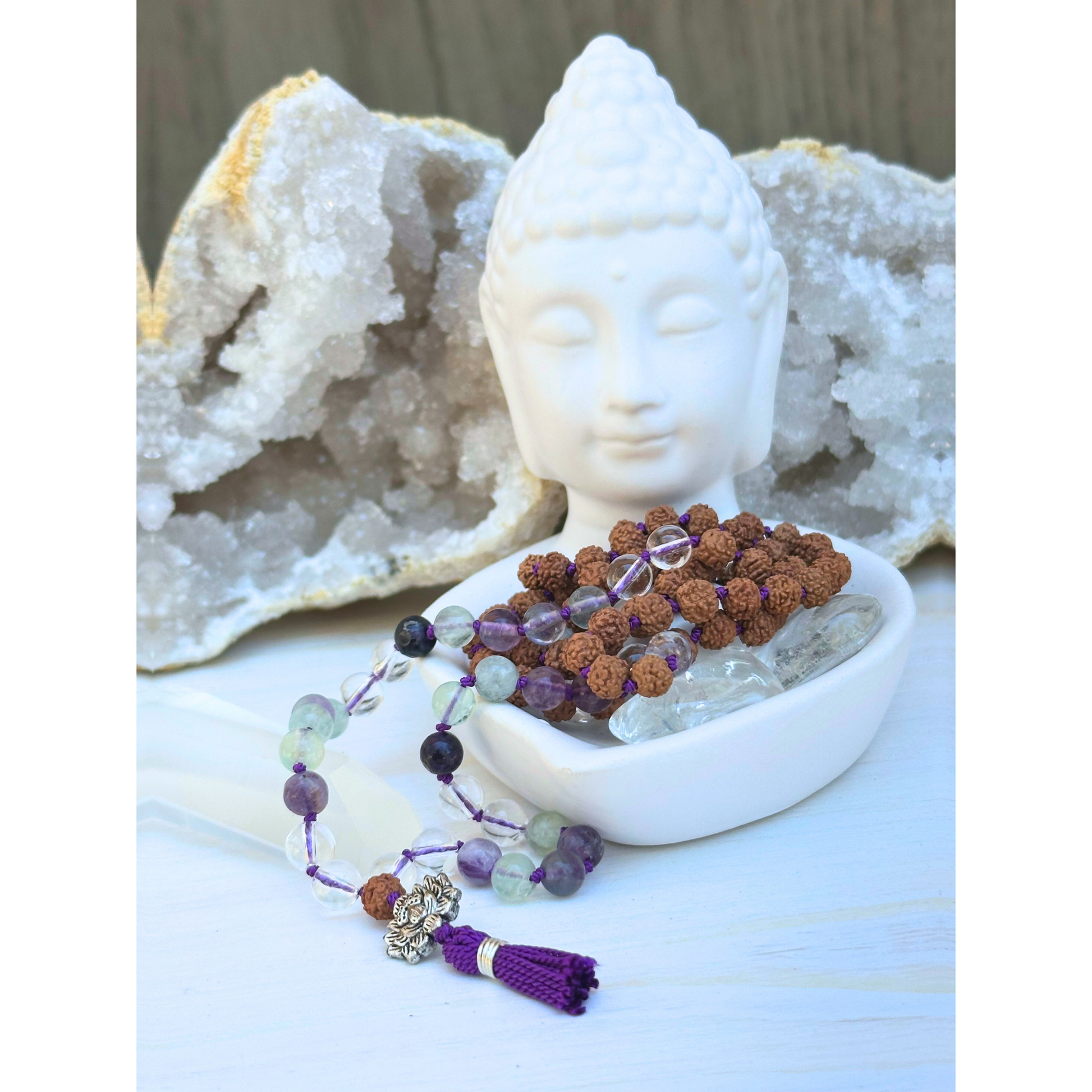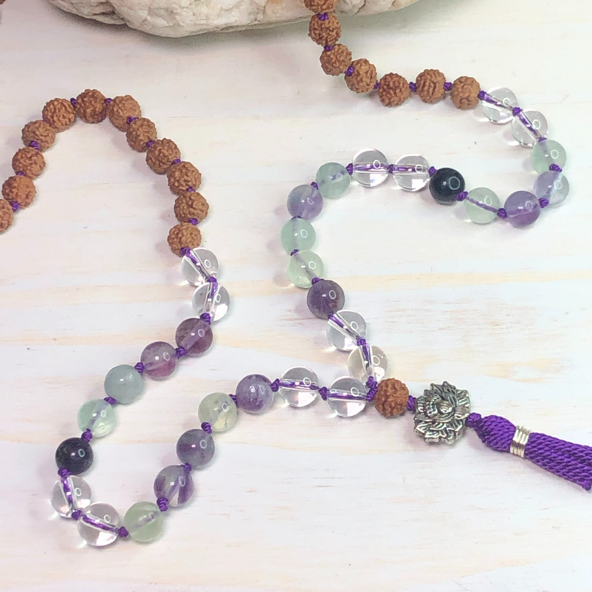 Rainbow Fluorite, Peruvian Clear Quartz & Rudraksha Mala with Lotus Charm